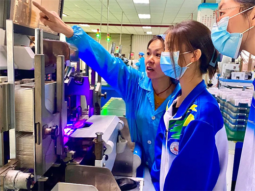 在云川光電生產(chǎn)車間,同學們一邊參觀紅外產(chǎn)品生產(chǎn)線,一邊向生產(chǎn)人員了解光電智能生產(chǎn)設備的相關知識,大家熱情高漲,充滿好奇,有的同學還禁不住現(xiàn)場請教和實踐操作。