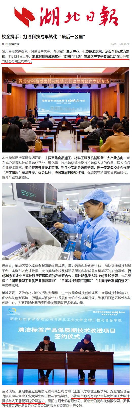 三大產業,七項技術需求,龍頭企業x實力高校,1121日上午,湖北省科技成果轉化“輕騎兵行動”樊城區產學研專場活動在萬洲電氣股份有限公司舉行。